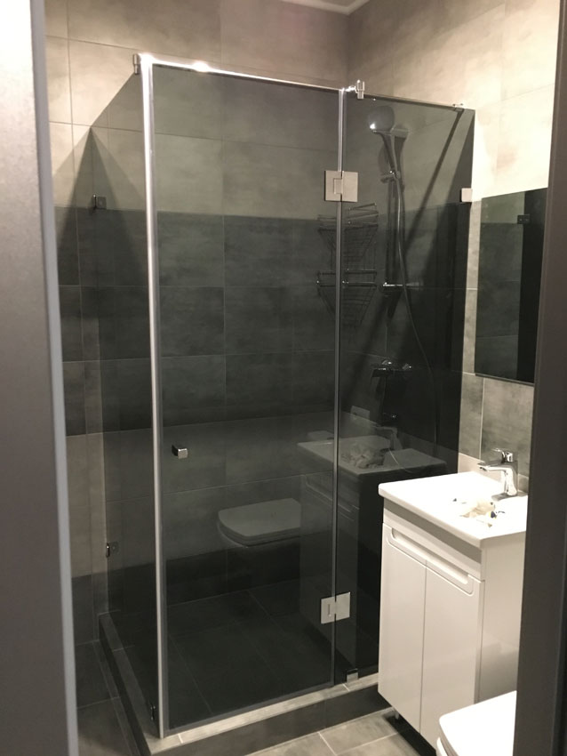 Разновидность душевой кабины из стекла квадратной формы, где есть 2 стенки. Вход может быть как центральный, так и боковой, в зависимости от выбранного вами варианта. Такое исполнение позволяет по максимуму экономить пространство.Варианты стекла для душевых