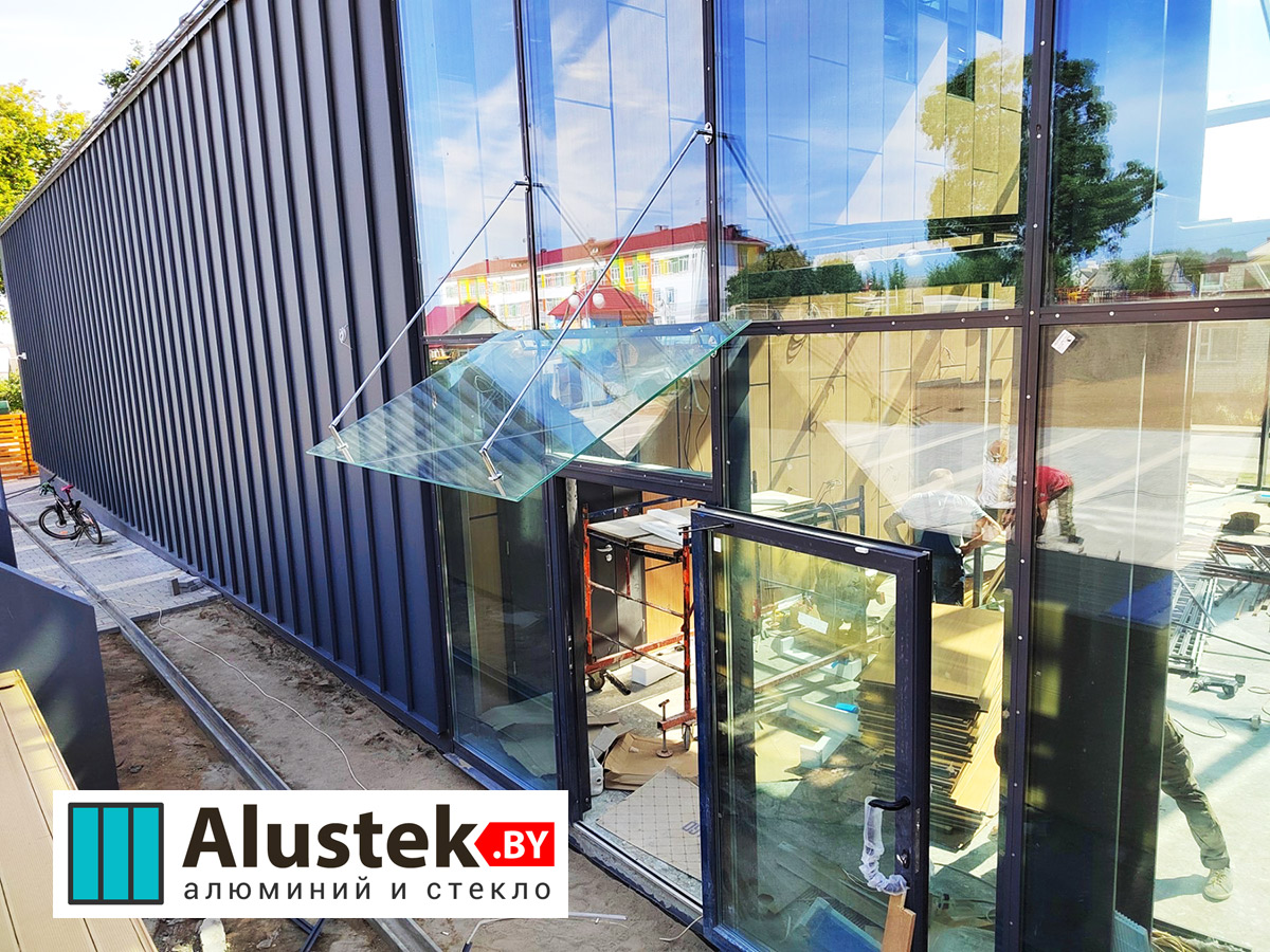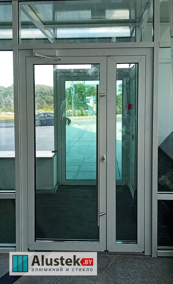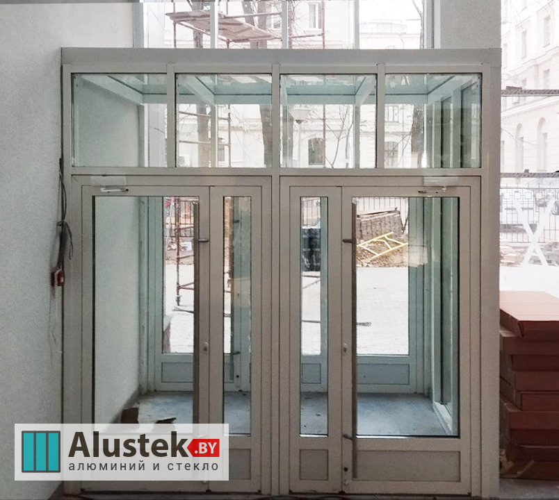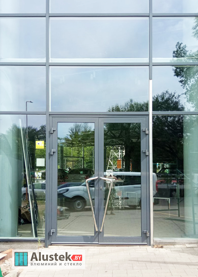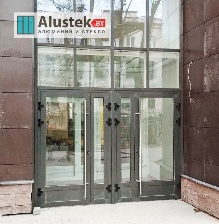 Одно из основных направлений компании Alustek.by – это производство и монтаж входных групп и дверей на базе стекла и алюминиевого профиля.