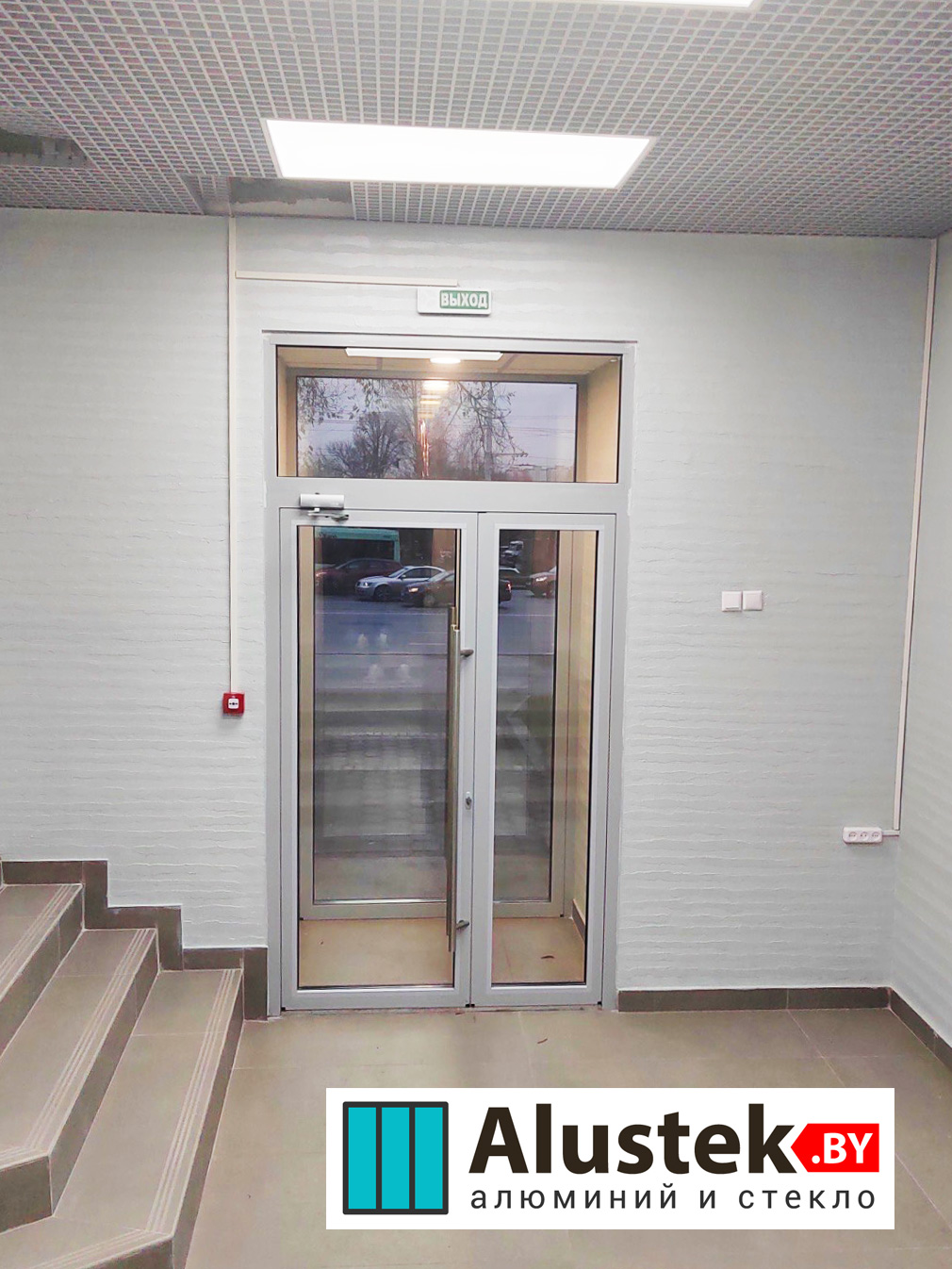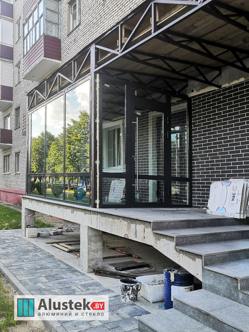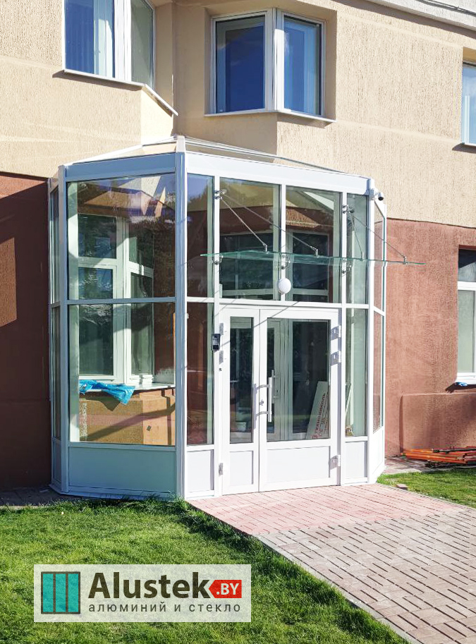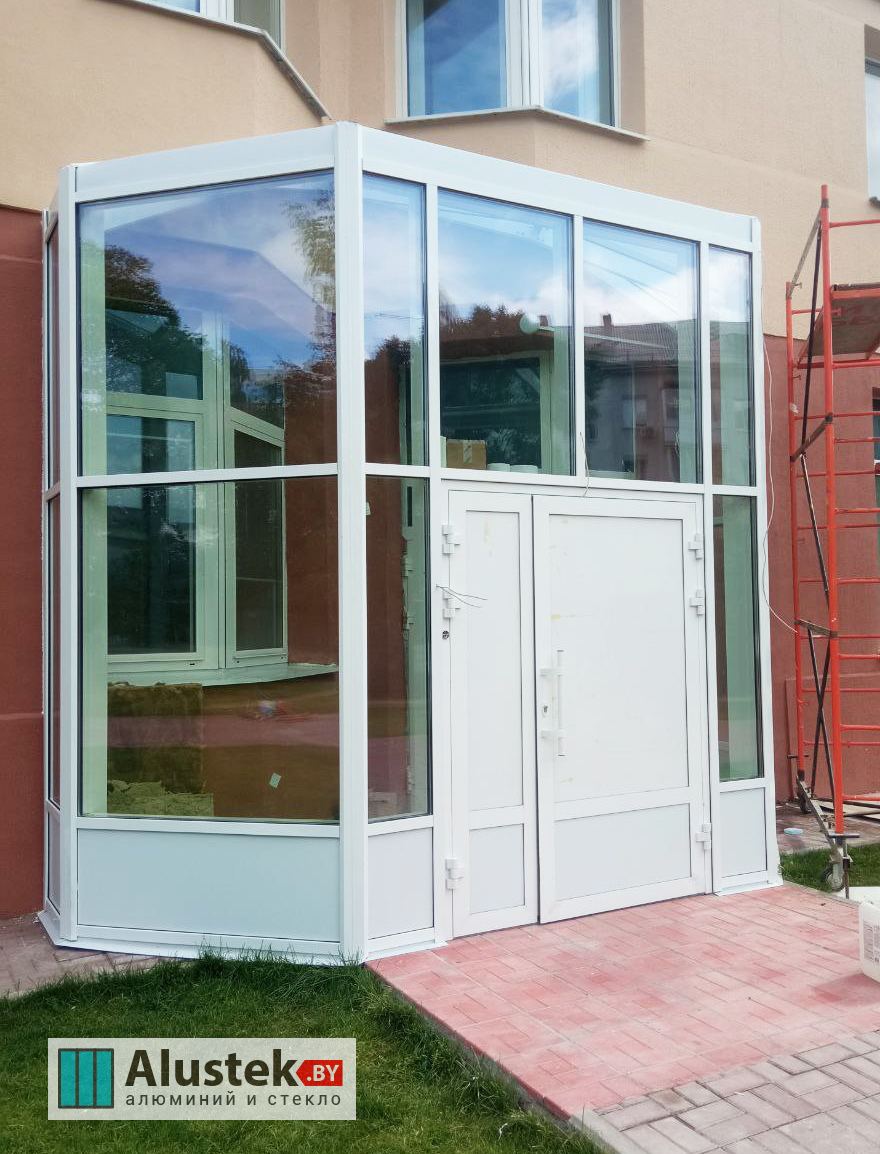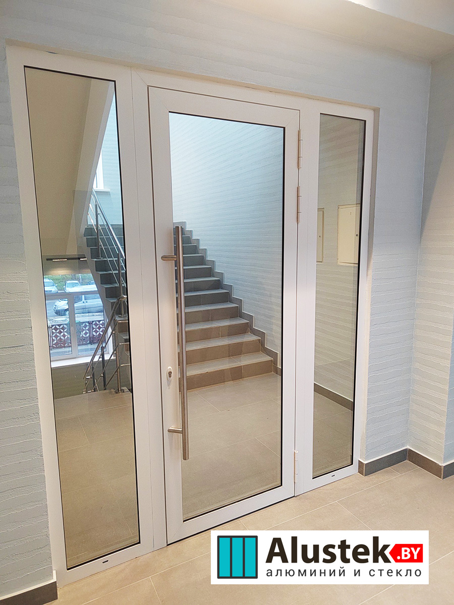 Одно из основных направлений компании Alustek.by – это производство и монтаж входных групп и дверей на базе стекла и алюминиевого профиля.