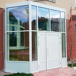 Входная группа из алюминиевого профиля это достаточно распространенное явление в современном строительстве. Сочетание алюминия, стекла и металлической фурнитуры позволяет получить большой светлый холл, который при этом будет защищен от уличного холода или жары буферной зоной.