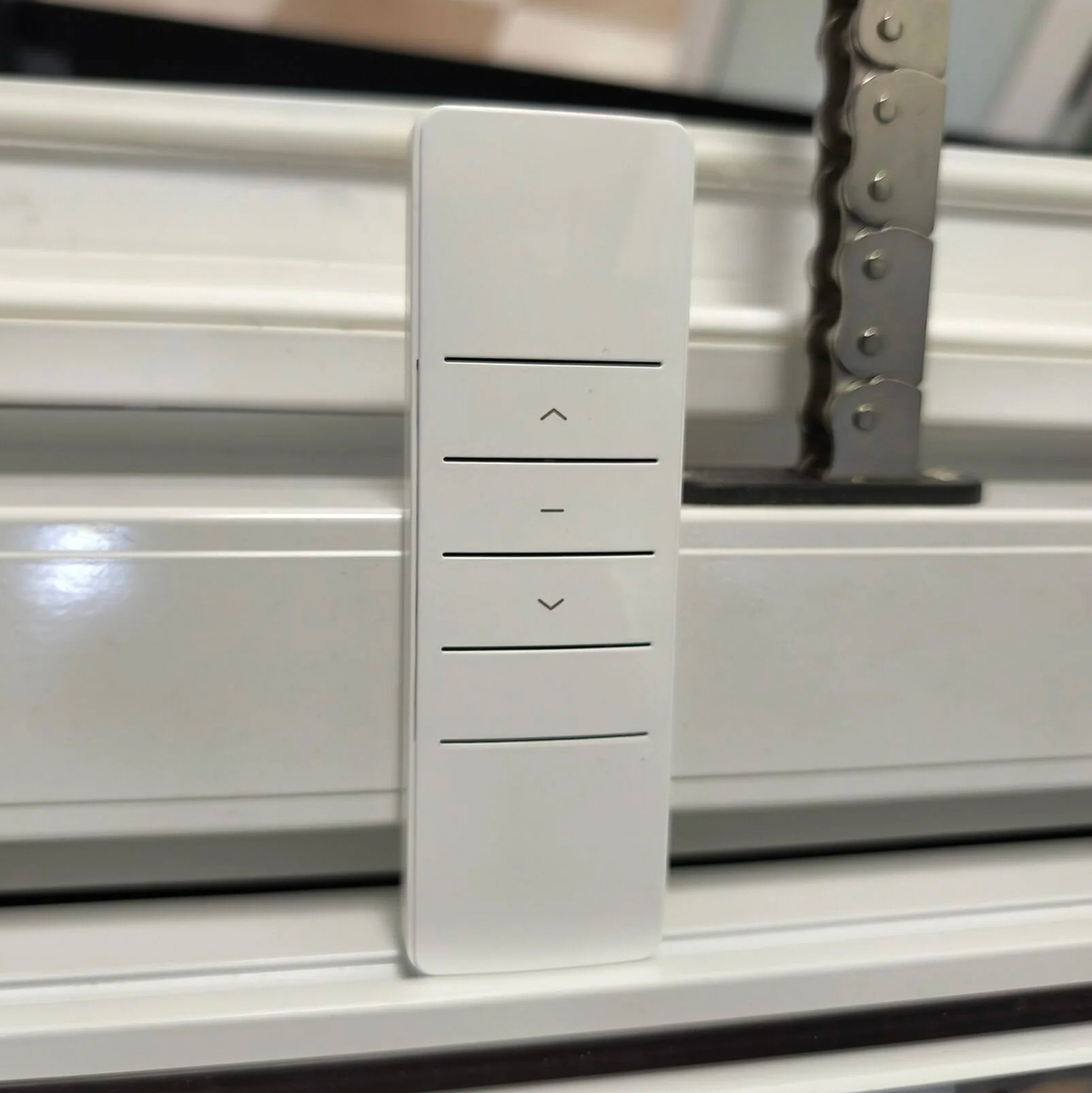 Электропривод с дистанционным управлением оснащен датчиком дождя, что обеспечит самостоятельное закрытие окна при попадании первых капель в проем окна. Также электропривод обеспечивает бесступенчатый режим проветривания на произвольную величину. Возможно использовать как люк для выхода на крышу, рассоединив привод и окно.