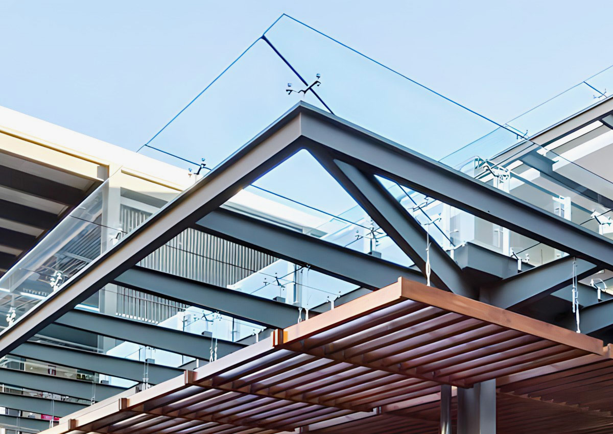 Для оформления входных групп в гостиницы, торгово-развлекательные центры и иные общественные здания можно использовать входные навесы из стекла на базе металлических ферм. Такой навес может занимать площади свыше 30 м.кв. и не требует монтажа к стене, так как несущими являются собственные опоры.